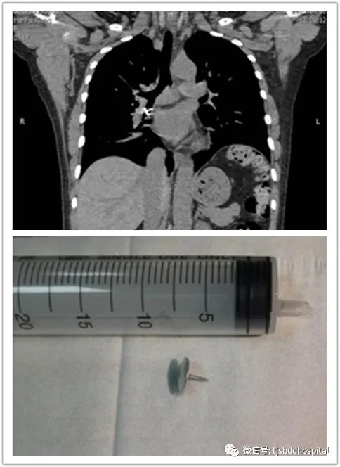 患者为1名中年女性,因误吸金属图钉后被家人紧急送往我院急诊科。急诊科接诊医师详细询问病史后通过立位腹平片及胸部CT检查结果确定金属图钉存在于支气管内,并第一时间联系呼吸与危重症医学科单淑香主任。时间就是生命,单淑香主任及其支气管镜团队、麻醉科高顺利副主任医师紧急会诊,对手术方法、麻醉方式、术中并发症预防与处理等制定出处置方案,并与患者及家属沟通,征得同意后为患者行无痛支气管镜下异物取出术。术中操作人员分工明确、紧密配合、耐心细致的实施每一个步骤,最终成功取出阻塞在右中间干支气管内的金属图钉,未发生气管损伤及其它并发症。患者术后意识逐渐清醒,生命体征平稳,患者及家属对医护人员高超的医术及高尚的医德表示赞佩和由衷的感谢。