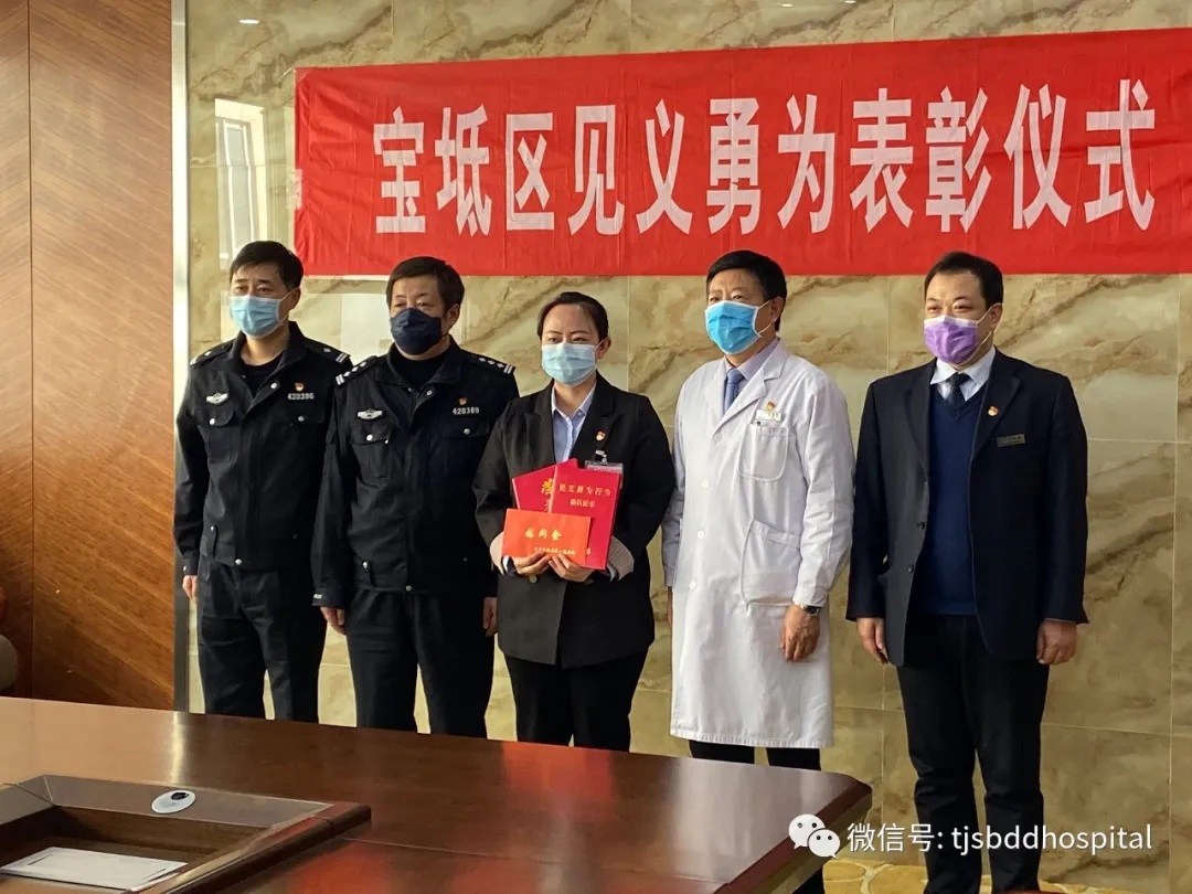2020年3月20日下午,宝坻区见义勇为表彰仪式在天津市宝坻区人民医院7号楼第四会议室举行,天津市公安局宝坻分局领导向我院财务物价处刘宏媛颁发了见义勇为证书和奖金。