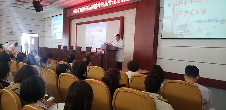 10月22日我院成功举办2020年麻醉药品和精神药品管理培训班。院党委委员、医务处处长苏红军出席并致辞。麻醉科尹立军主任主持。来自我院临床中级及以上职称医师和肿瘤科、药剂科、麻醉科全体医师及各乡镇医院代表约200余人参加。