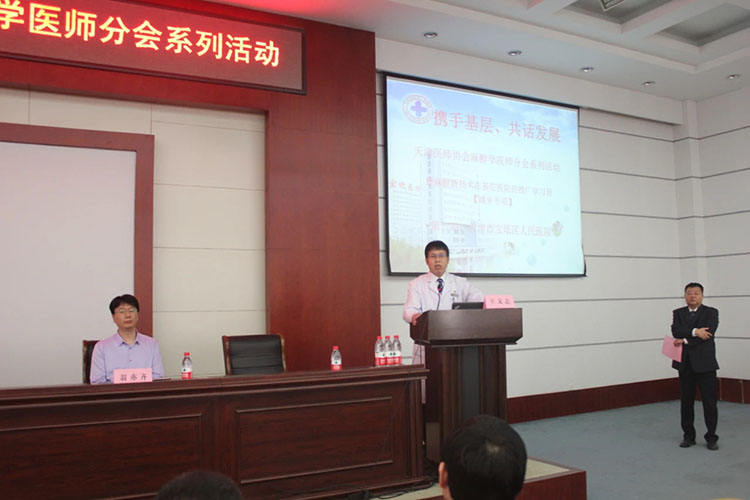 10月25日,由天津医师协会麻醉学分会主办的“携手基层•共话发展” 暨麻醉新技术继续教育学习班在天津市宝坻区人民医院举行。来自天津市及河北省麻醉学专家及各医院代表等100多人参会。副院长王文志参加并致欢迎词。天津医师学会麻醉学分会主任委员、天津医师协会麻醉医师分会主任委员、天津市总医院麻醉科主任于永浩教授致辞。麻醉科主任尹立军主持。